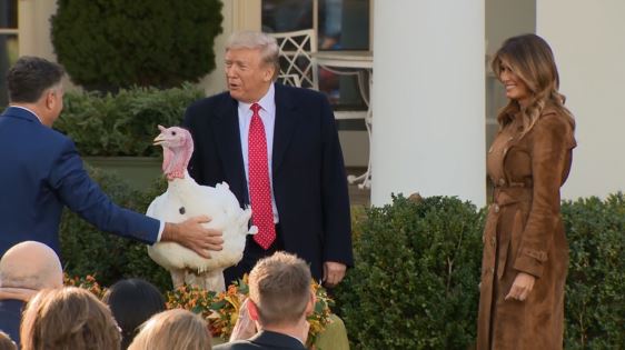 昨天,總統特朗普和第一夫人梅拉尼婭在白宮玫瑰園出席第72屆感恩節火雞赦免儀式,「赦免」2019年感恩節幸運火雞「黃油」和「麵包」,同時不忘借題發揮調侃正在進行的彈劾調查。